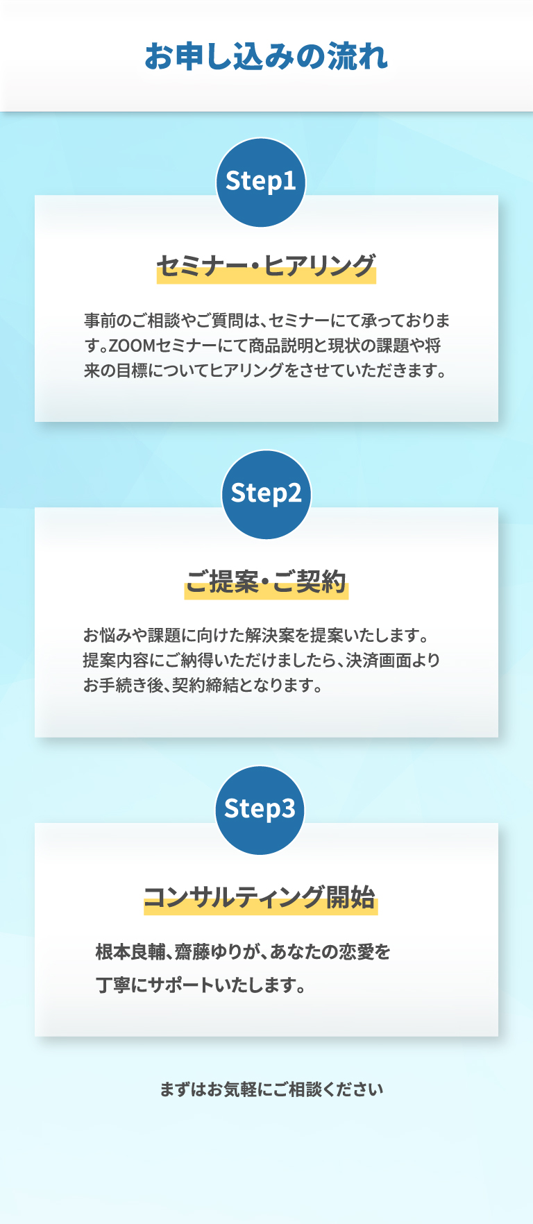 東京大学中退後、大学時代全くモテなかったことから恋愛を学び、今の彼女(スタッフである齋藤ゆり)と出会い恋愛コンサルタントになる。指導実績は3000人を超え日々感謝の声をいただいている。